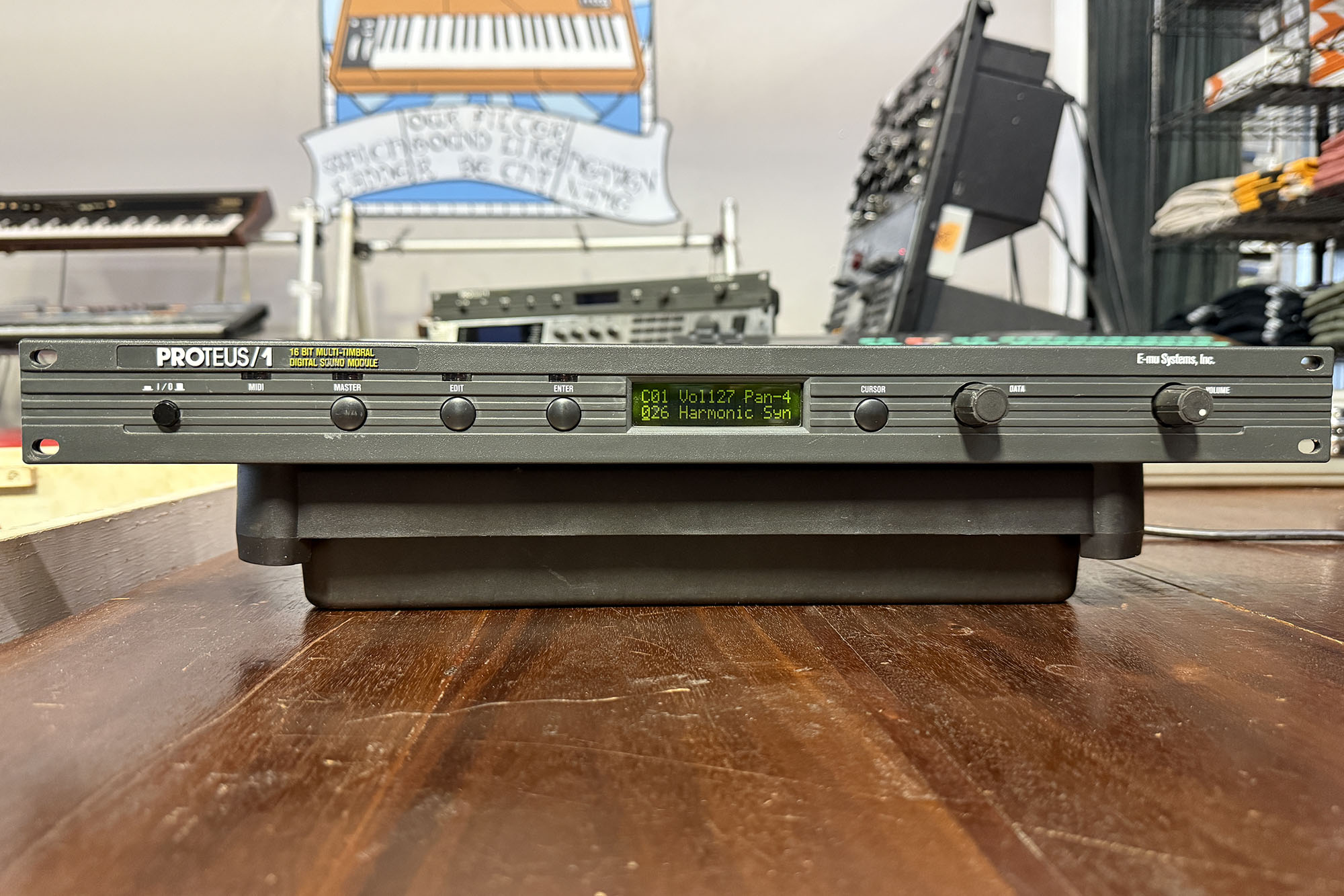 This E-Mu Proteus 1 rack synth has so many great sounds from the 90's! Excellent synths, basses, pads, elegant and lush strings and brass and so much more! All in one rack at a sweet price. It works great, fully functional. See pics for usual wear.