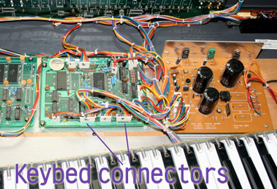 The keybed wiring goes to two identical 8-pin connectors on the CPU board; it is very important not to plug the wiring connectors into the wrong board connectors, so use a Sharpie to mark the connectors before unplugging them.